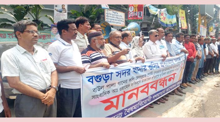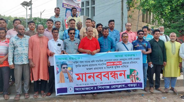 শিবগঞ্জ (বগুড়া) প্রতিনিধি বগুড়ার শিবগঞ্জে বাউল পালা গানের কলি সামাজিক যোগাযোগ মাধ্যম ফেসবুকে পোস্ট দেওয়ায় কুচক্রি মহলের প্ররোচনায় সাংবাদিক ওয়াহেদ ফকিরকে গ্রেফতারের প্রতিবাদে, মামলা প্রত্যাহার ও নিঃশর্ত মুক্তির দাবিতে মানববন্ধন