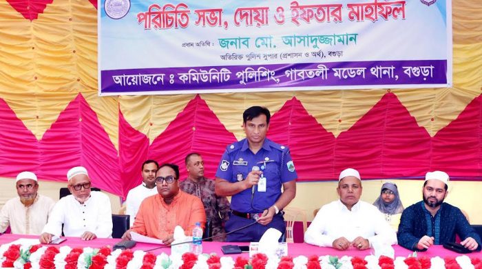 গাবতলী (বগুড়া) প্রতিনিধি মঙ্গলবার (২৫মার্চ) বগুড়ার গাবতলী মডেল থানা কমিউনিটি পুলিশিং ফোরামের পরিচিতি সভা দোয়া ও ইফতার মাহফিল থানা চত্বরে অনুষ্ঠিত হয় এতে প্রধান অতিথির বক্তব্য রাখেন অতিরিক্ত পুলিশ সুপার