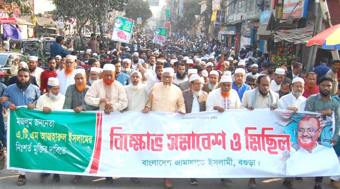 স্টাফ রিপোর্টার জামায়াতে ইসলামীর সহকারি সেক্রেটারি জেনারেল এটিএম আজহারুল ইসলামের মুক্তি এবং দলের নিববন্ধন ও প্রতিক ফিরে পাওয়ার দাবীতে বগুড়ায় বিক্ষোভ মিছিল ও সমাবেশ করেছে জামায়াত। বেলা সাড়ে ৩টায় পৌর