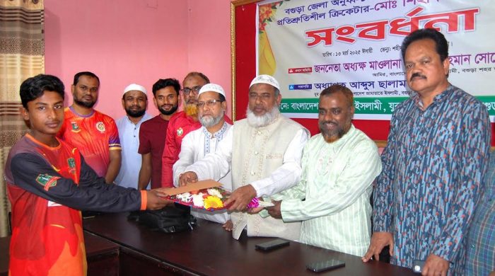 প্রেস বিজ্ঞপ্তি বাংলাদেশ ক্রিকেট বোর্ড আয়োজিত ইয়ং টাইগার্স অনুর্ধ্ব-১৬ জাতীয় ক্রিকেট প্রতিযোগিতায় রাজশাহী বিভাগীয় চ্যাম্পিয়ন বগুড়া অনুর্ধ্ব-১৬ দলের অধিনায়ক শিহাব আহম্মেদকে সংবর্ধনা দিয়েছে জামায়াত। বাংলাদেশ জামায়াতে ইসলামী বগুড়া শহর শাখার