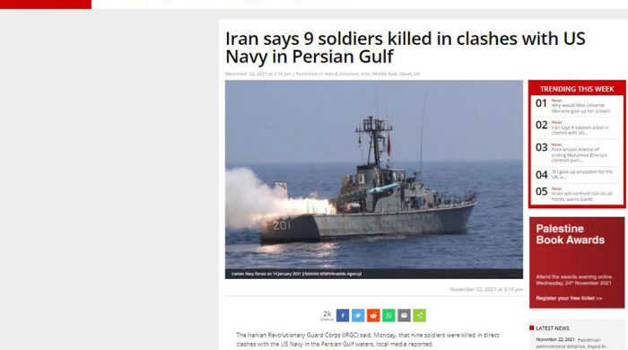 পারস্য উপসাগরের জলসীমায় মার্কিন নৌবাহিনীর সাথে সংঘর্ষে ৯ জন ইরানি সেনা নিহত হয়েছে বলে জানিয়েছে ইরানের এলিট ফোর্স হিসেবে পরিচিত রেভল্যুশনারি গার্ড কর্পস (আইআরজিসি)। তুর্কি গণমাধ্যম আনাদোলু এজেন্সির রবাত দিয়ে