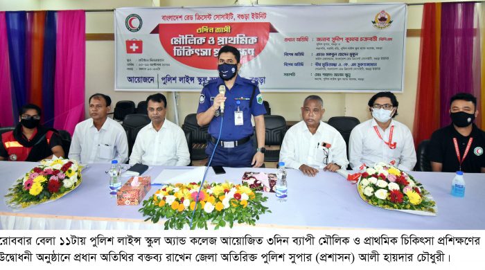 বগুড়া পুলিশ লাইন্স স্কুল অ্যান্ড কলেজে তিনদিন ব্যাপি মৌলিক ও প্রাথমিক চিকিৎসা প্রশিক্ষণের উদ্বোধনী অনুষ্ঠানে প্রধান অতিথির বক্তব্য জেলার অতিরিক্ত পুলিশ সুপার আলী হায়দার চৌধুরী বলেছেন, যুগোপযোগী মৌলিক প্রশিক্ষণ শিক্ষার্থীদের