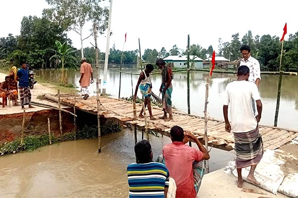 স্টাফ রিপোর্টার, ঢাকা বগুড়ার সারিয়াকান্দিতে বন্যার পানির তোড়ে উপজেলার জামথল খেয়াঘাটের সড়কটি ধসে গেছে। ধসে যাওয়া অংশে বালির বস্তা ফেলে মেরামত করার চেষ্টা করা হচ্ছে এবং সড়ক পারাপারে তাৎক্ষণিকভাবে বাঁশের