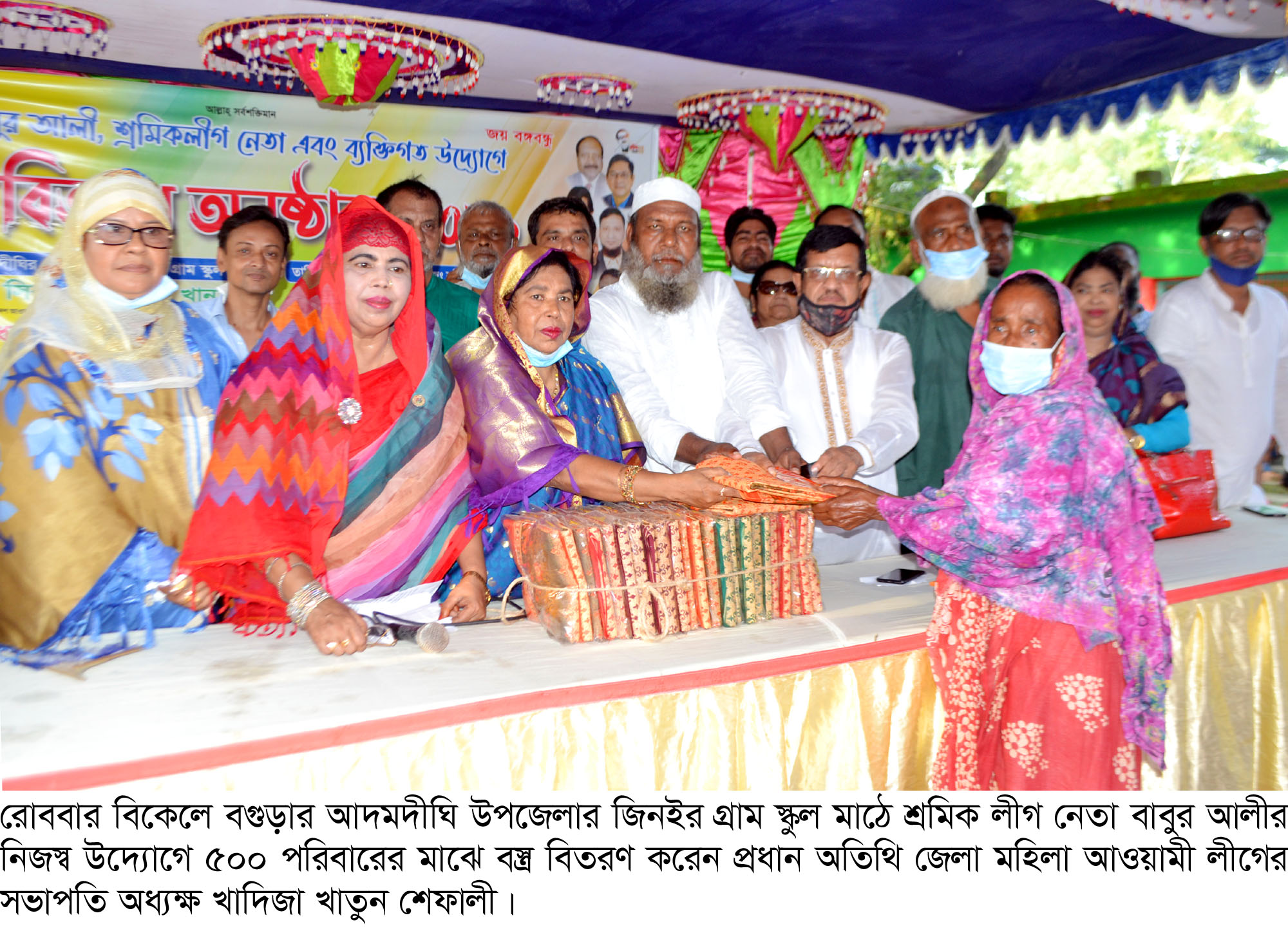 স্টাফ রিপোর্টার, বগুড়া বগুড়ার আদমদীঘি উপজেলার ২ নম্বর ওয়ার্ডের ৫০০ পরিবারের মাঝে বস্ত্র বিতরণ করেন শ্রমিক লীগ নেতা বাবুর আলী। রোববার বেলা ৪টার দিকে উপজেলার জিনইর গ্রাম স্কুল মাঠে ব্যক্তিগত