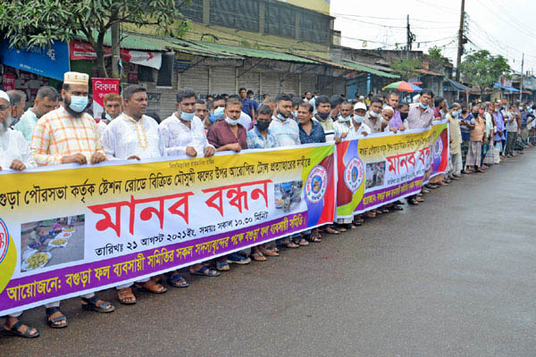 বগুড়ায় পৌর টোল প্রত্যাহারের দাবিতে ফল ব্যবসায়ীদের মানববন্ধন