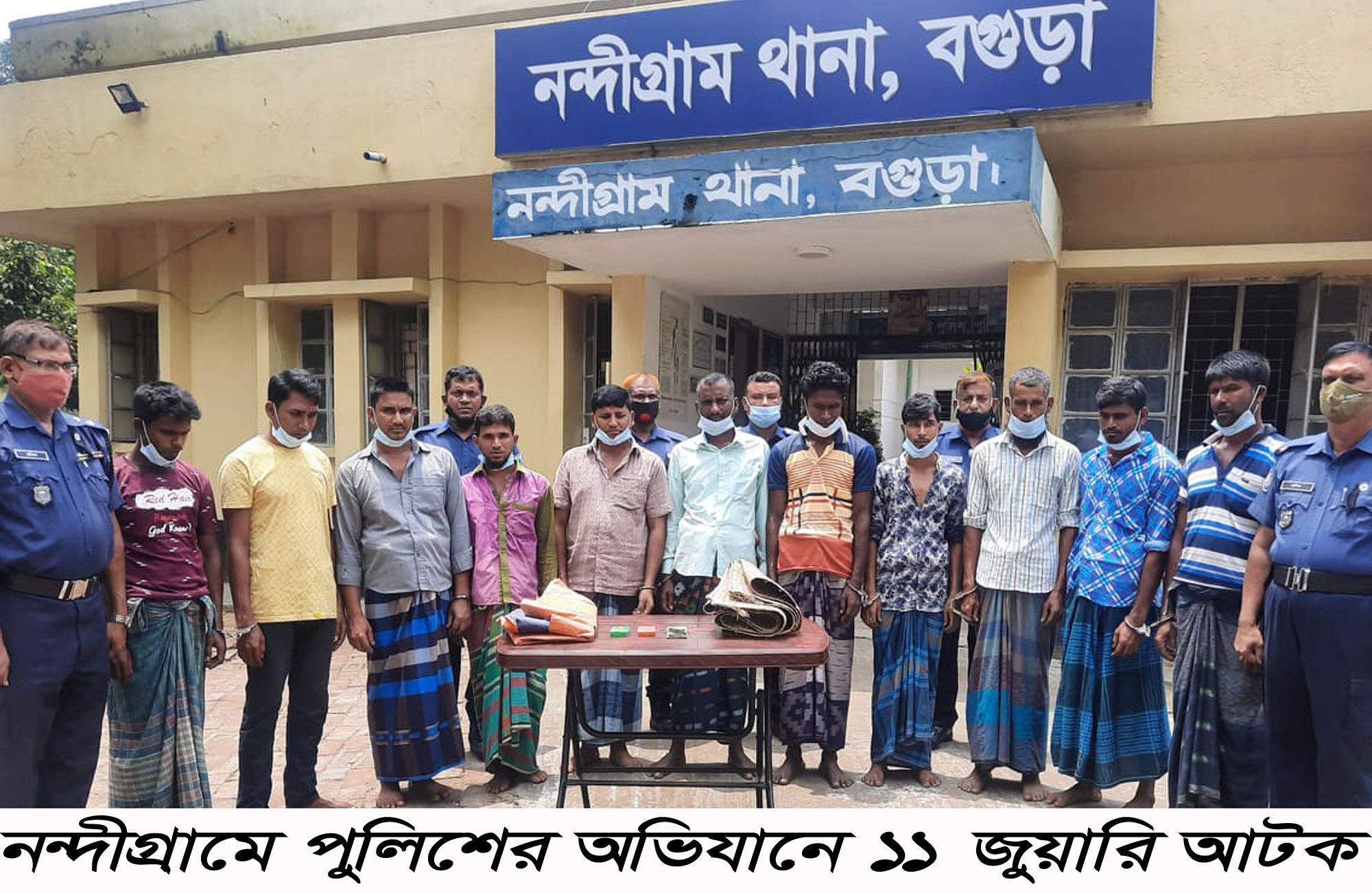 নন্দীগ্রাম (বগুড়া) প্রতিনিধি বগুড়ার নন্দীগ্রাম উপজেলায় পুলিশের অভিযানে ১১ জুয়াড়িকে আটক করা হয়েছে। এসময় জুয়ার আসর থেকে সরঞ্জামাদিসহ নগদ টাকা উদ্ধার করা হয়েছে। মঙ্গলবার (১০ আগষ্ট) দুপুরে নন্দীগ্রাম থানা অফিসার