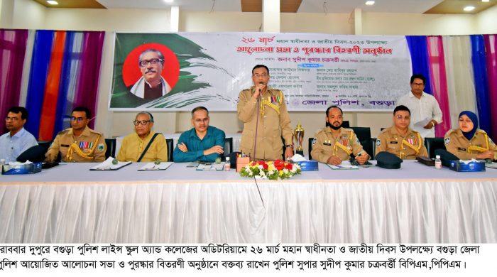 রোববার ২৬ মার্চ মহান স্বাধীনতা ও জাতীয় দিবস উপলক্ষ্যে বগুড়া জেলা পুলিশের আয়োজনে পুলিশ লাইন্স স্কুল অ্যান্ড কলেজের অডিটরিয়ামে বেলা ১১টায় আলোচনা সভা ও বিভিন্ন প্রতিযোগিতার পুরস্কার বিতরণ করা হয়েছে।