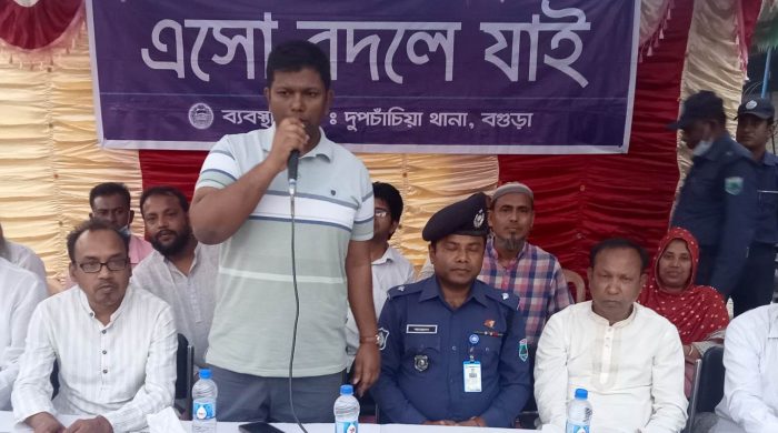 আজ রোববার বিকালে দুপচাঁচিয়া থানা পুলিশের আয়োজনে চৌমুহনী বাজার চত্বরে সন্ত্রাস, মাদক, ইভটিজিং ও নারী নির্যাতন, বাল্যবিয়ে প্রতিরোধে জনসচেতনতামুলক সভা অনুষ্ঠিত হয়েছে। “এসো বদলে যাই” এই প্রতিপাদ্য বিষয়কে সামনে রেখে