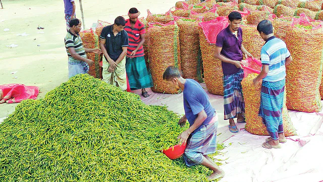 বগুড়ার পাইকারি বাজার মহাস্থান হাটে কাঁচা মরিচের দামে হঠাৎ করে ধস নেমেছে। এ বাজারে মাঝারি মানের প্রতি কেজি কাঁচা মরিচ গতকাল বুধবার বিক্রি হয়েছে ১০ টাকায়। এক মাস আগেও এই