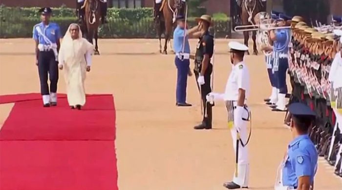 ভারতের রাষ্ট্রপতি ভবনে প্রধানমন্ত্রী শেখ হাসিনাকে গার্ড অব অনার দেওয়া হয়েছে। শনিবার সকালে প্রধানমন্ত্রী শেখ হাসিনাকে স্বাগত জানাতে রাষ্ট্রপতি ভবনে লাল গালিচা বিছানো হয়। এ সময় ভারতের প্রধানমন্ত্রী নরেন্দ্র মোদি