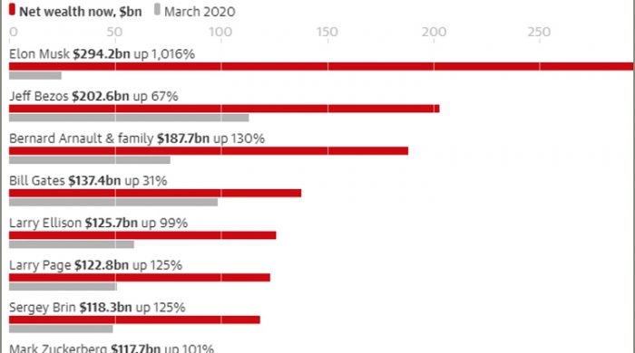 বিশ্বব্যাপী করোনা মহামারি শুরুর পর থেকে শীর্ষ ১০ ধনী ব্যক্তির সম্পদের পরিমাণ দ্বিগুণ হয়েছে। আন্তর্জাতিক দাতব্য সংস্থা অক্সফাম বলছে, বিশ্বের এই শীর্ষ ১০ ধনীর সম্পদের পরিমাণ ১ দশমিক ৫ ট্রিলিয়ন