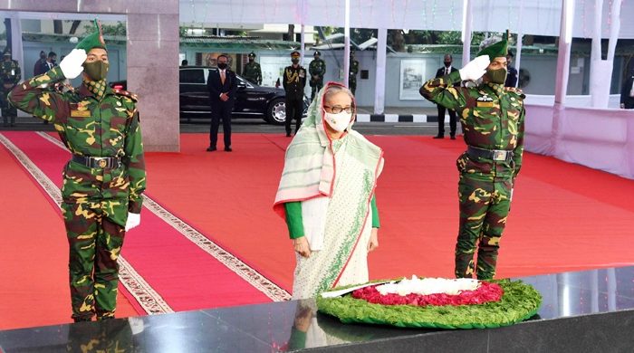 জাতির জনক বঙ্গবন্ধু শেখ মুজিবুর রহমানের স্বদেশ প্রত্যাবর্তন দিবস উপলক্ষে বঙ্গবন্ধুর প্রতিকৃতিতে শ্রদ্ধা জানিয়েছেন প্রধানমন্ত্রী শেখ হাসিনা। সোমবার (১০ জানুয়ারি) সকালে ধানমন্ডি ৩২ নম্বরে ঐতিহাসিক বঙ্গবন্ধু ভবনের সামনের প্রতিকৃতিতে পুষ্পস্তবক