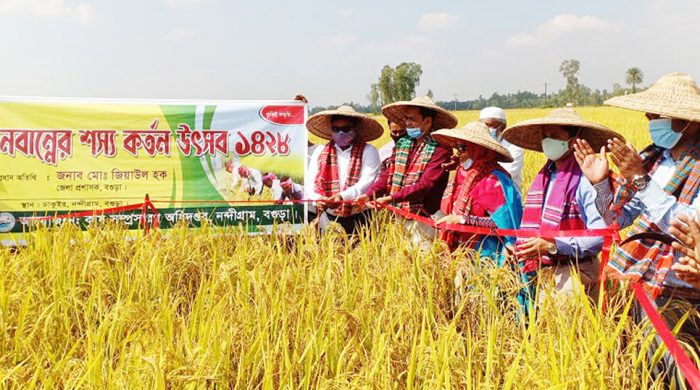 হাতে কাস্তে, মাথায় বাঁশের তৈরি এক প্রকার মাথাল ও গলায় গামছা নিয়ে বগুড়ার নন্দীগ্রামে নবান্ন উৎসবের ধান কাটলেন জেলা প্রশাসক (ডিসি) মো. জিয়াউল হক। আজ মঙ্গলবার (৯ নভেম্বর) দুপুরে নন্দীগ্রাম