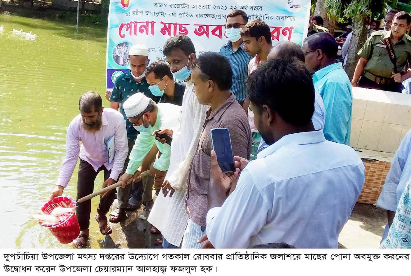 দুপচাঁচিয়া(বগুড়া) প্রতিনিধি দুপচাঁচিয়া উপজেলা মৎস্য দপ্তরের উদ্যোগে রাজস্ব বাজেটের আওতায় বিভিন্ন প্রাতিষ্ঠানিক জলাশয়ে রুই জাতীয় মাছের পোনা অবমুক্ত করা হয়েছে। রোববার দুপুরে উপজেলা প্রশাসনের পুকুরে এ মাছের পোনা অবমুক্ত করে