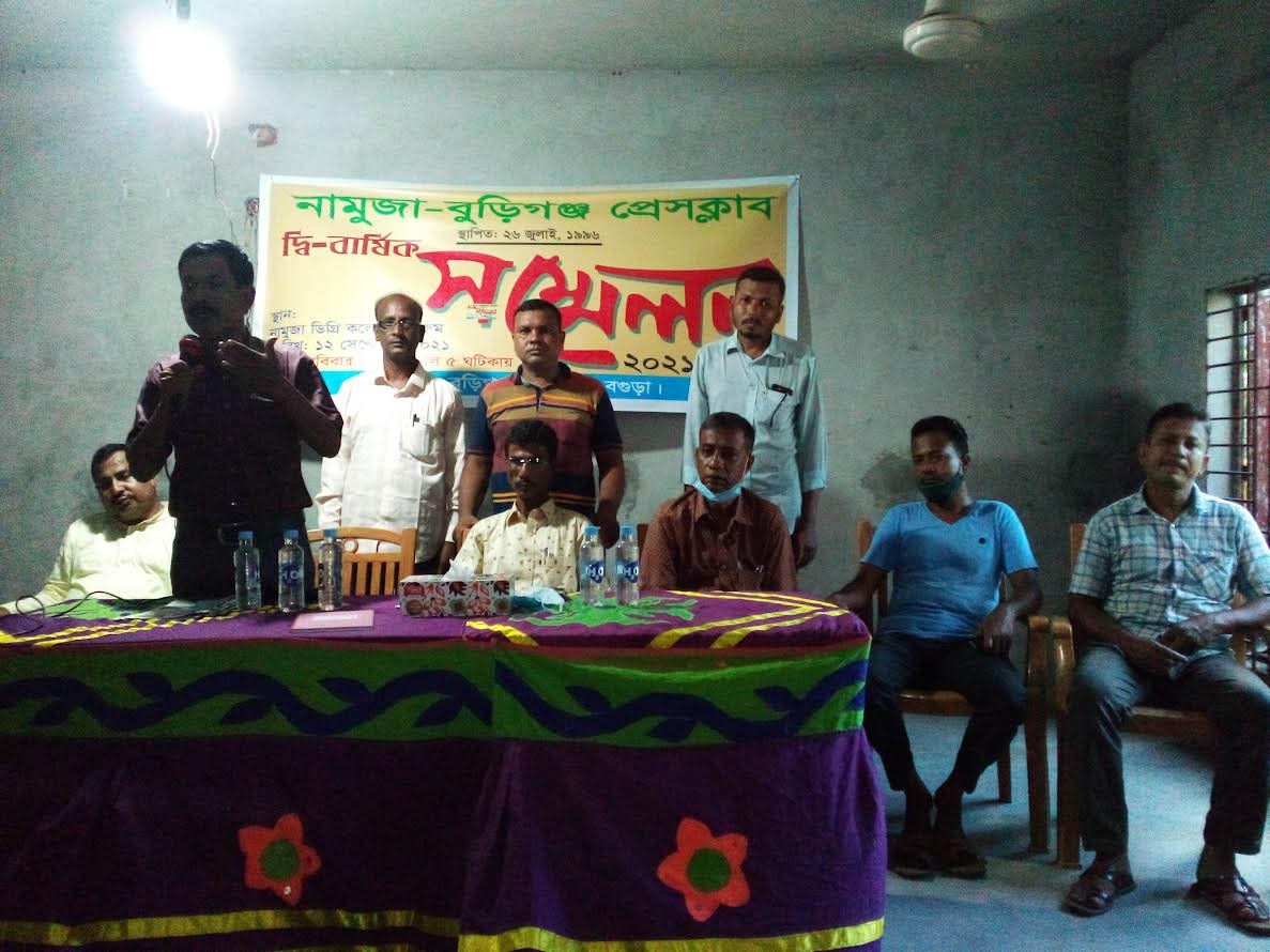 নামুজা (বগুড়া) প্রতিনিধি ১২ সেপ্টেম্বর (রবিবার) বিকালে বগুড়ার নামুজা ডিগ্রি কলেজ হলরুমে নামুজা-বুড়িগঞ্জ প্রেসক্লাবের দ্বি-বার্ষিক সম্মেলন অনুষ্ঠিত হয়। এতে সভাপতিত্ব করেন অত্র প্রেসক্লাবের সভাপতি ফজলুল হক জুয়েল। প্রধান অতিথি হিসেবে
