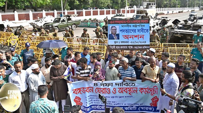 রাষ্ট্রপতি মো. সাহাবুদ্দিনের পদত্যাগসহ চার দফা দাবিতে বঙ্গভবনের সামনে অবস্থান নিয়েছেন বিভিন্ন সংগঠনের কর্মীসহ শিক্ষার্থীরা। মঙ্গলবার (২২ অক্টোবর) দুপুর সাড়ে ৩টার দিকে তারা ঘেরাও ও অবস্থান কর্মসূচির উদ্দেশ্যে বঙ্গভবনের সামনে