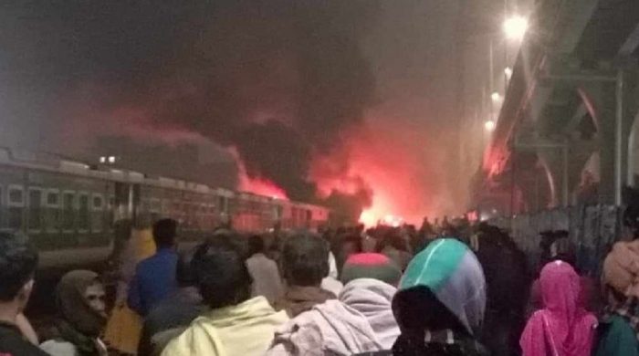 রাজধানীর তেজগাঁও রেলস্টেশনে নেত্রকোণার মোহনগঞ্জ থেকে ছেড়ে আসা মোহনগঞ্জ এক্সপ্রেস ট্রেনের তিনটি বগিতে আগুন দিয়েছে দুর্বৃত্তরা। এ ঘটনায় চারজনের মরদেহ উদ্ধার করা হয়েছে। মঙ্গলবার সকালে আগুন দেয়া হয়। বিষয়টি নিশ্চিত