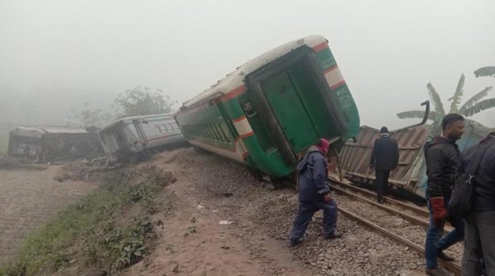 দিনাজপুরে ট্রেনের ধাক্কায় ট্রাক চূর্ণবিচূর্ণ, ইঞ্জিনসহ ৫ বগি লাইনচ্যুত
