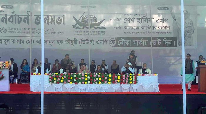 দ্বাদশ জাতীয় সংসদ নির্বাচনের প্রচারণার অংশ হিসেবে রংপুরের তারাগঞ্জ উপজেলার সভামঞ্চে অবস্থান করছেন প্রধানমন্ত্রী শেখ হাসিনা। মঙ্গলবার (২৬ ডিসেম্বর) বেলা ১১টা ৫০ মিনিটে সৈয়দপুর বিমানবন্দর থেকে সড়ক পথে তারাগঞ্জ সভামঞ্চে