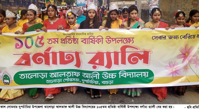 আজ সোমবার দুপচাঁচিয়া উপজেলার তালোড়া আলতাফ আলী উচ্চ বিদ্যালয়ের ১০৫তম প্রতিষ্ঠা বার্ষিকী বিভিন্ন কর্মসূচির মধ্যে দিয়ে উদযাপিত হয়েছে। এ দিন সকালে বিদ্যালয় থেকে এক বর্ণাঢ্য র্যালি বের করা হয়। র্যালীটি